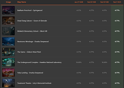 I play for a couple of hours every day and maps like Toba Landing, Nostromo Wreckage, The Game, Badham Preschool and Midwich Elementary School appear way too often. I have also read a lot of posts on Reddit about the same issue and you can also see similar stats on non-official sites. Please check the official statistics to see if the issue really exists